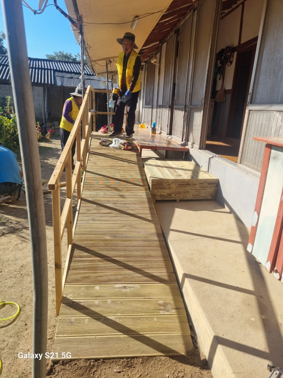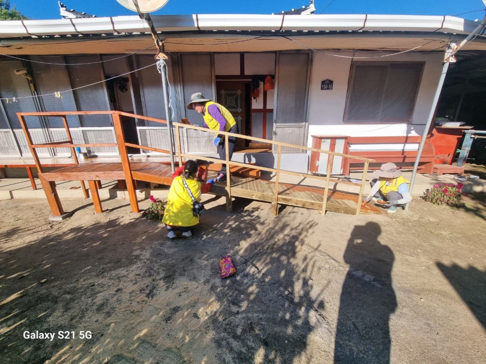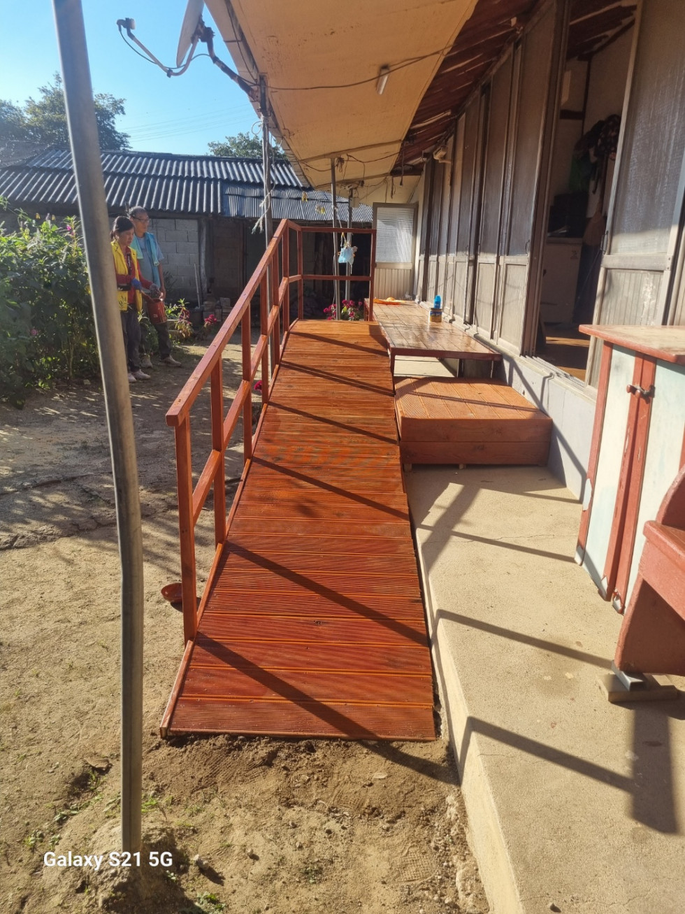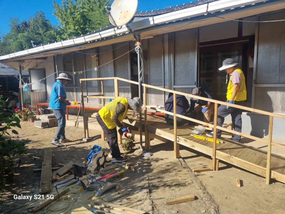 회원들은 안전한 생활을 돕기 위해 땁방을을 흘리며 정성껏 발판과 난간 설치 작업을 이어갔습니다
