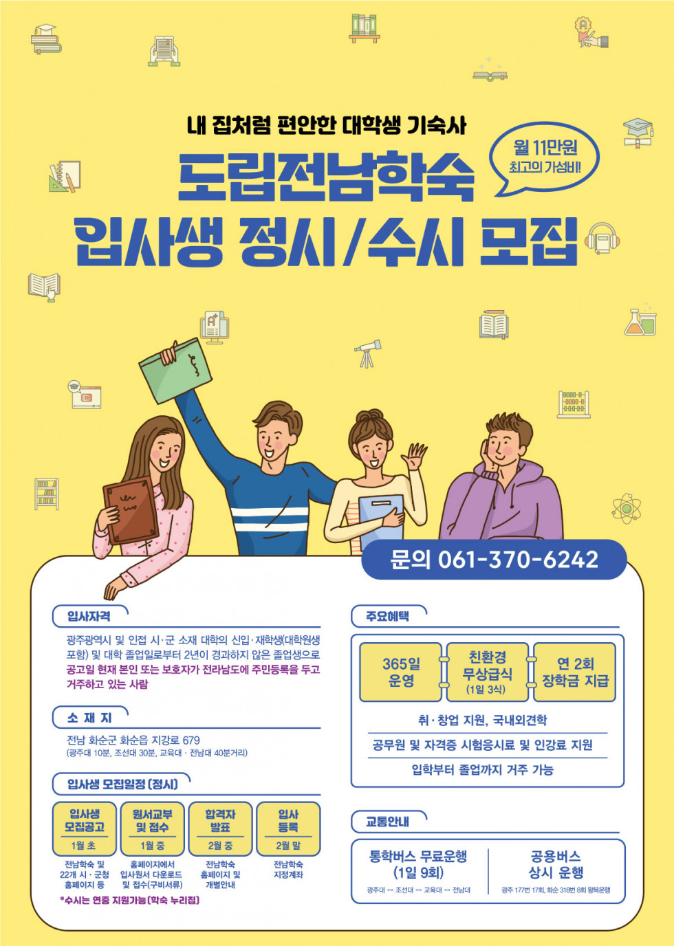 전라남도에서 전남출신 대학생 중 광주광역시 및 인접 시군 소재 대학 신입·재학생의 면학 지원을 위해 2026년도 도립 전남학숙 신규 입사생을 모집하고자 붙임과 같이 게시합니다.