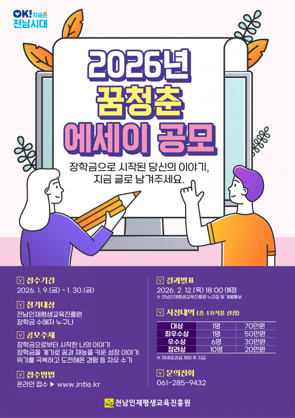 장학생으로 선발되어 장학금을 받은 학생들의 진솔한 이야기가 담긴 에세이를 「2026년 꿈청춘 에세이 공모전」을 통해 다음과 같이 모집하오니, 많은 학생들의 참여 바랍니다.