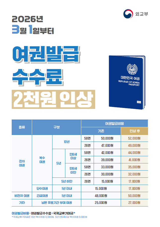 여권발급수수료 2천원 인상 안내(2026. 3. 1. 시행)